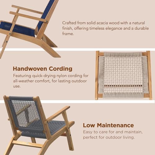 Patio Sense 62773 Vega Natural Stain Outdoor Chair Acacia Wood Construction Hand Woven Seat Mid Century Design Comfortable Reclining Armchair Patio Lawn Garden Backyard Deck – Ecru Cording