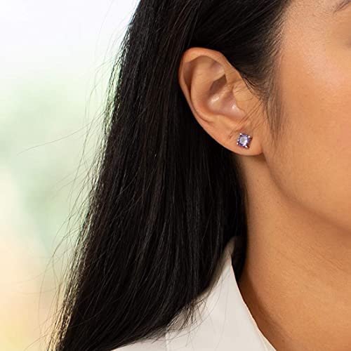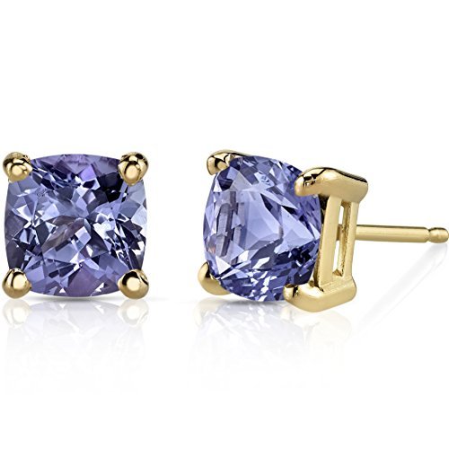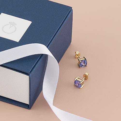 Peora Solid 14K Yellow Gold Tanzanite Stud Earrings for Women, Genuine Gemstone Solitaire, AAA Grade Cushion Cut 6mm, 2 Carats total, Friction Back, Tanzanite Gold Earrings, Dainty Earrings Studs