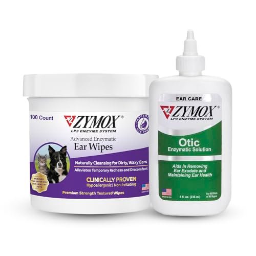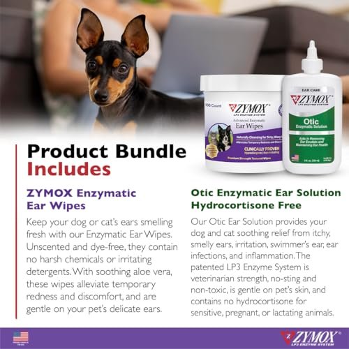 PET KING BRANDS ZYMOX Enzymatic Ear Wipes and Otic Solution Hydrocortisone Free for Dogs & Cats – Product Bundle – for Dirty, Waxy, Smelly Ears & to Soothe Infections, 100 Count Wipes & 8 oz Bottle