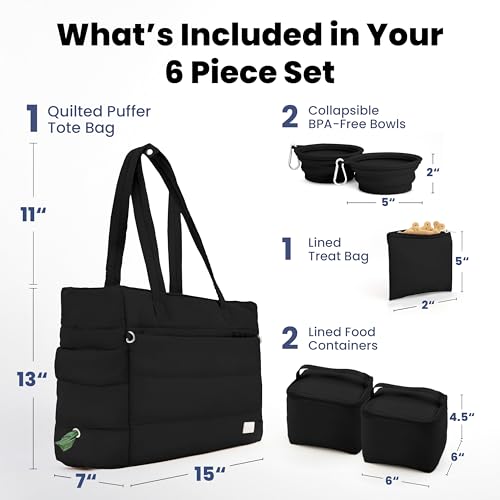 Puffer Dog Travel Bag for Dog Moms – Doggy Diaper Bag with Pet Bowls & Food Storage or Everyday Puffy Tote – Christmas Doggy Mom Gifts for Women – Lightweight, Travel-Ready Gift for Pet Lovers – Black