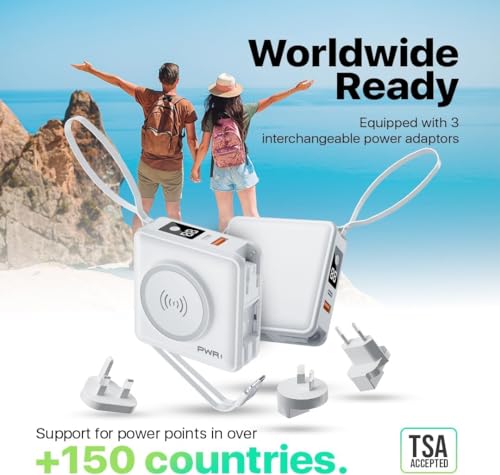 PWRMobile PWR Travel PRO 5-in-1 Power Bank – 10,000mAh with Built-in Cables – 20W USB-C + 15W Wireless Charging – Compact Portable Charger for iPhone & Android – White