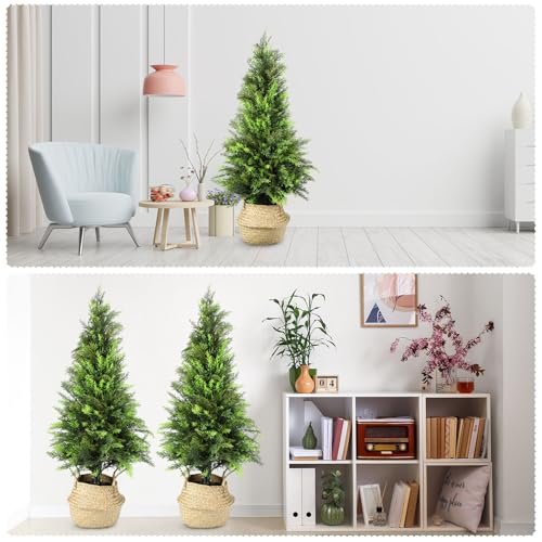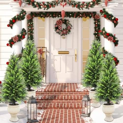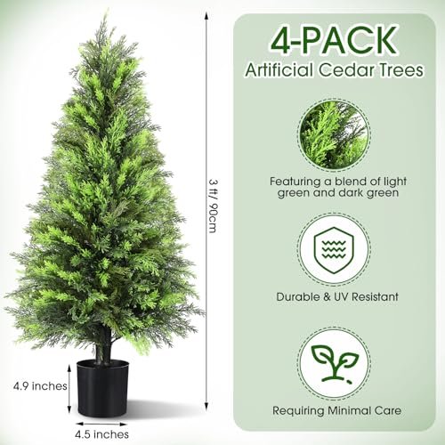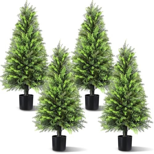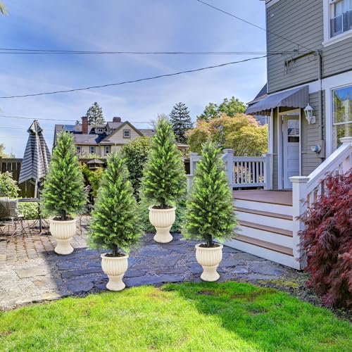 Riceshoot 4 Pcs 3ft Artificial Cedar Topiary Trees for Outdoor Artificial Plants Faux Pine Tree UV Resistant Potted Fake Plants Shrub Bushes for Porch Garden Office Front Door Indoor