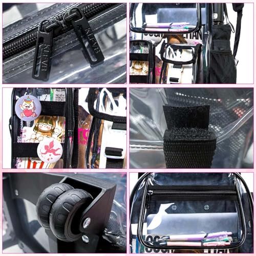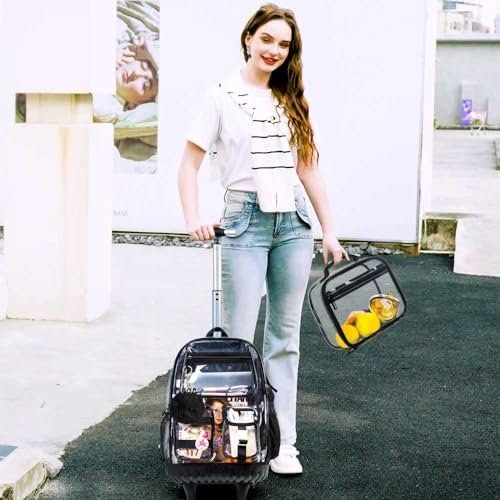 Rolling Clear Backpack for Women, Heavy Duty PVC Transparent Wheeled Bookbag, See Through School Bags with Wheels for Teens Elementary Travel – Black