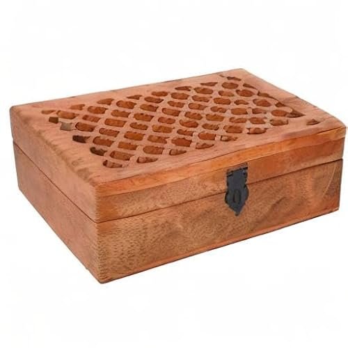 Samhita Mango Wood Decorative Wooden Box with Hinged Lid in Jali Carvings Used as Storage Box Christmas Gifts Items (9″ x 6″ x 3′)