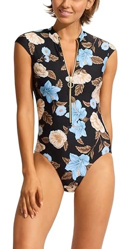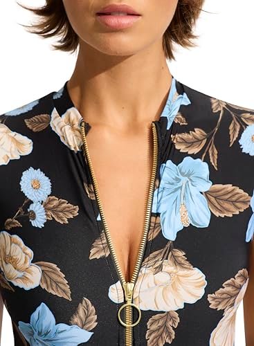 Seafolly Women’s Standard Cap Sleeve Zip Front One Piece Swimsuit, Garden Party Black
