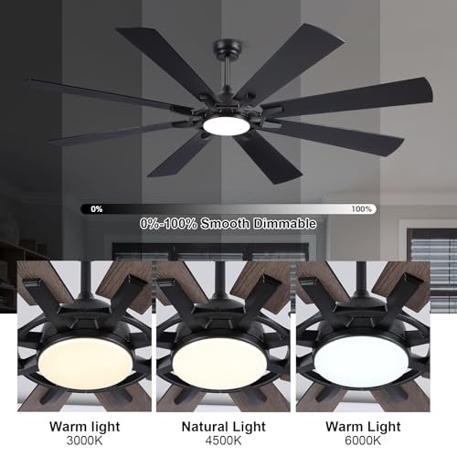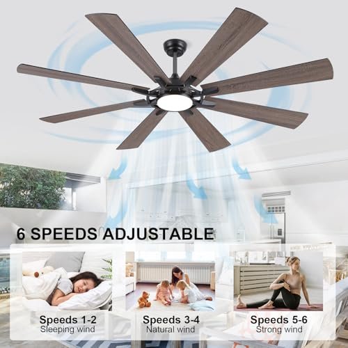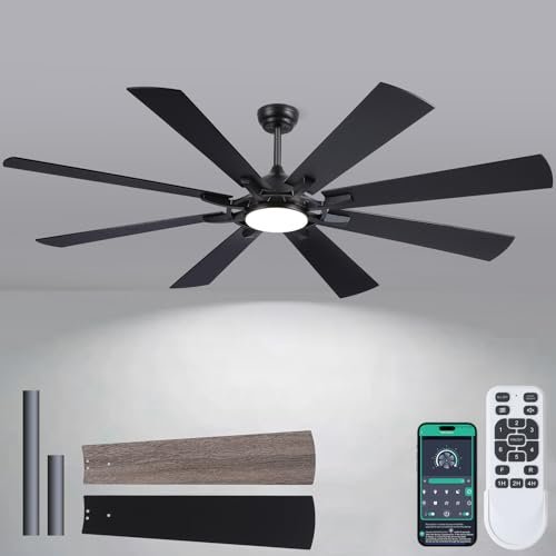 SHIHOT 72inch Large Ceiling Fan with Light and Remote, Indoor/Outdoor Black Fan Lights for Patios, Led Living Room Modern Ceiling Fan, 6 Speed Reversible Quiet DC Motor, 8H Timing, Dimmer, 8 Blades