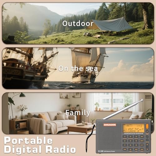SIHUADON R108 Portable Shortwave Radio AM/FM/SW/LW/Airband Battery Operated Radio with Good Reception, Rechargeable Great Sound Speaker Stereo Alarm Clock External Antenna (Grey)