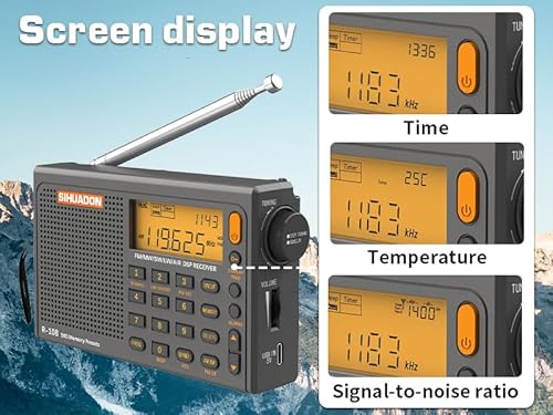 【Varies Functions】[Memory]: Portable Shortwave Radios with band ATS(Auto Search), 500 memories preset station, quickly pick up strong signal stations. Sleeping timer and alarm clock,ensure you never miss your favorite radio station. LCD display shows temperature and Signal-to-Noise Ratio, helping you find the best reception place, Good for everyone.