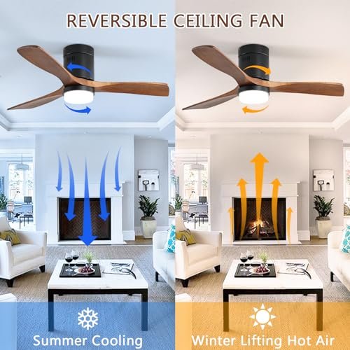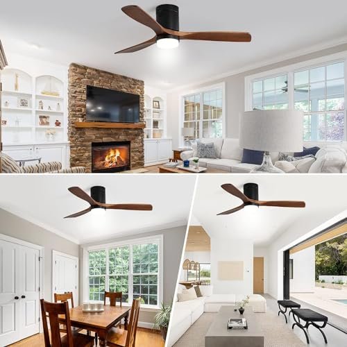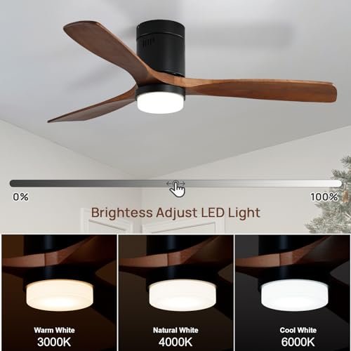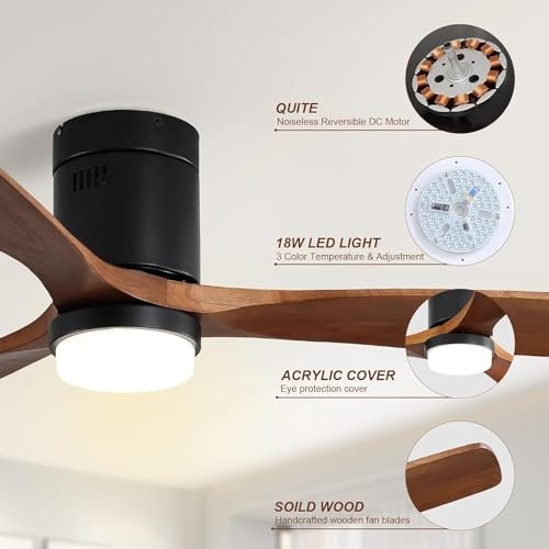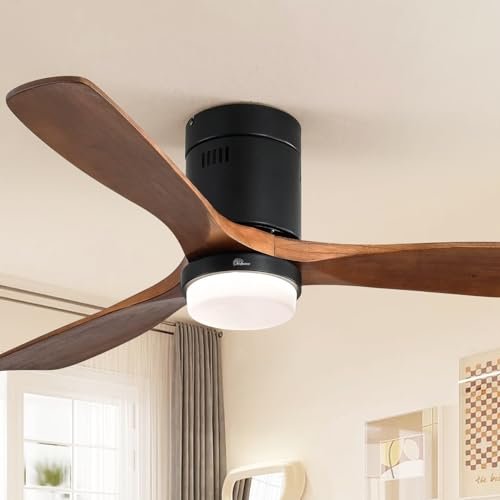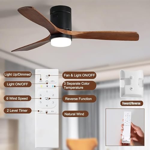 Sofucor 52 Inch Low Profile Ceiling Fans with Lights and Remote, 6-Speed Dimmable Outdoor Ceiling Fan with Light 3 Walnut Blades Wood Ceiling Fan with Timer, Reversible DC Motor for Patio Bedroom
