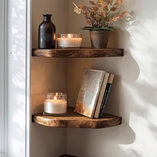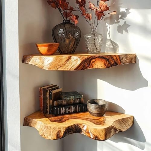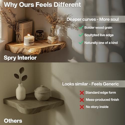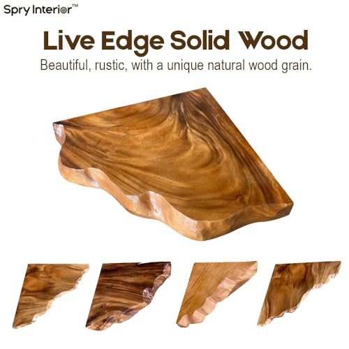 SpryInterior Farmhouse Live Edge Corner Floating Shelf – Handcrafted Rustic Solid Wood, Heavy-Duty Hidden Brackets, Wall Mounted Decor for Bedroom, Living Room – (11.7”W x 11.7”D x 1.4”H, Natural)