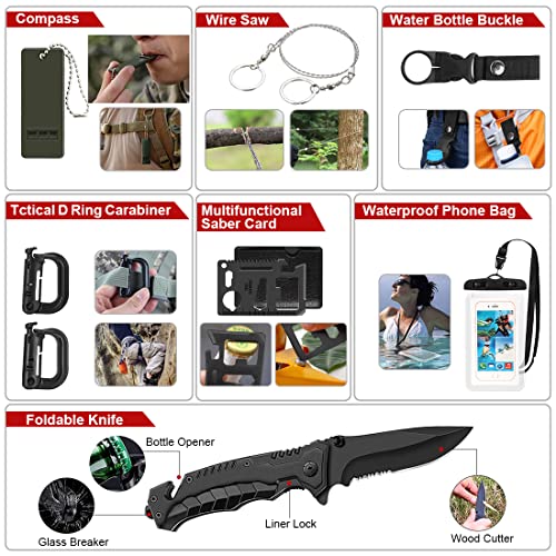 High Quality&Wide Uses:Made of durable and premium quality material.This Survival Kit is great for firefighters, first aid personnel, hikers, campers, outdoor sports enthusiasts, etc. It is ideal for car,travel, hunting, camping, hiking, fishing,cycling, outdoor sports, wilderness adventure and natural disasters such as earthquake, tornado, flood.