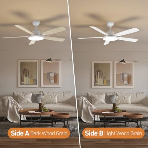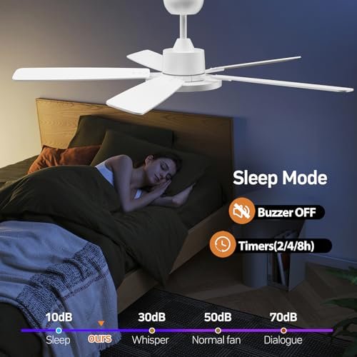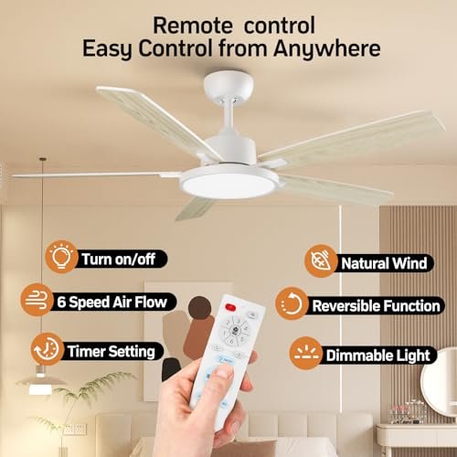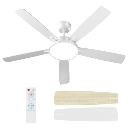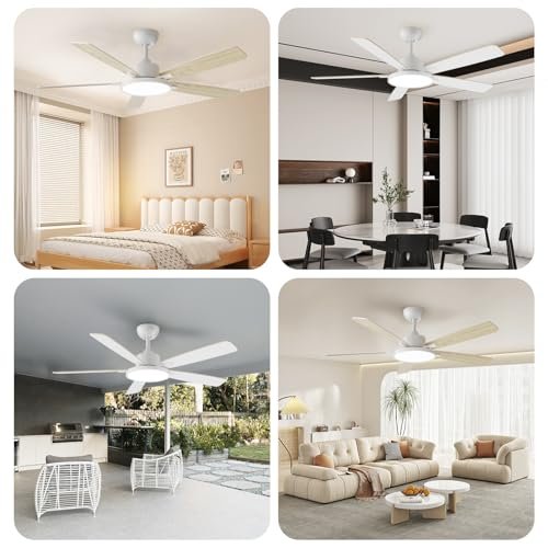 TALOYA 52 Inch White Ceiling Fans with Lights Led Remote Control Flush Mount Low Profile for Bedroom Living Dining Room Outdoor Farmhouse Patio,Reversible,DC Motor,Diammable,Buzzer ON/Off,5 Blades