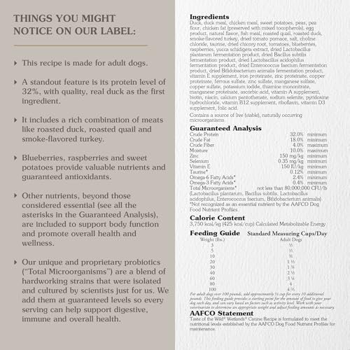 Taste of the Wild Wetlands with ROASTED FOWL dry dog food; REAL DUCK is the #1 ingredient; high-protein (32%) to help support bones, joints and LEAN, STRONG MUSCLES