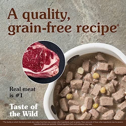 Taste of the Wild High Prairie with BISON in gravy canned dog food; REAL MEAT is the #1 ingredient; a unique and flavorful blend of proteins helps support bones, joints and LEAN, STRONG MUSCLES