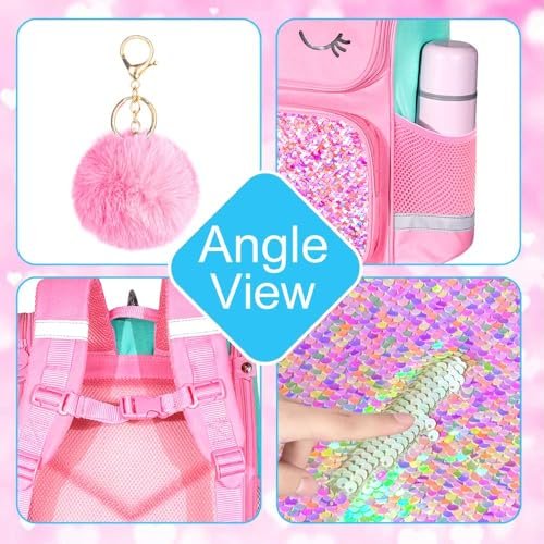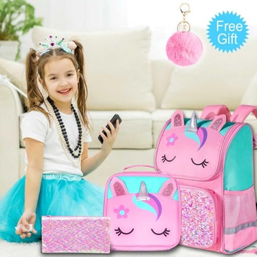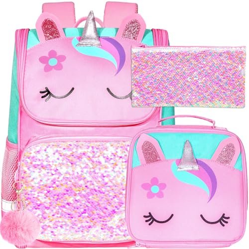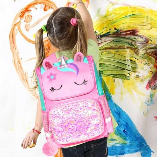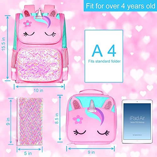 UFNDC 3PCS Unicorn Backpack for Girls, 15″ Kids Sequin Bookbag with Lunch Box, Pink School Bag for Elementary Preschool Toddler