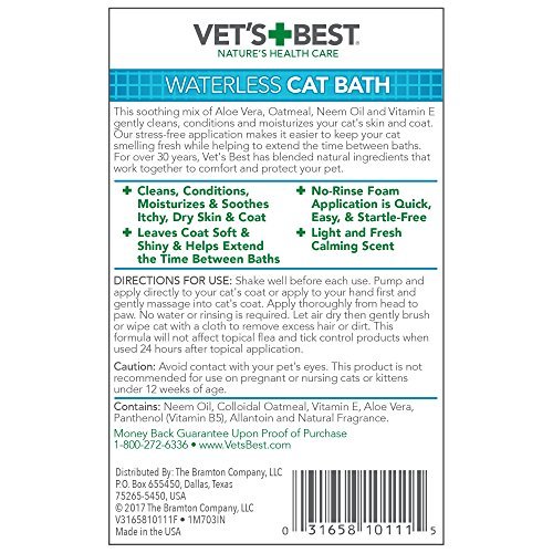 QUICK AND EASY DRY CAT SHAMPOO : Vet’s Best Waterless Cat Shampoo’s rinse-free foam application is quick, easy and startle-free