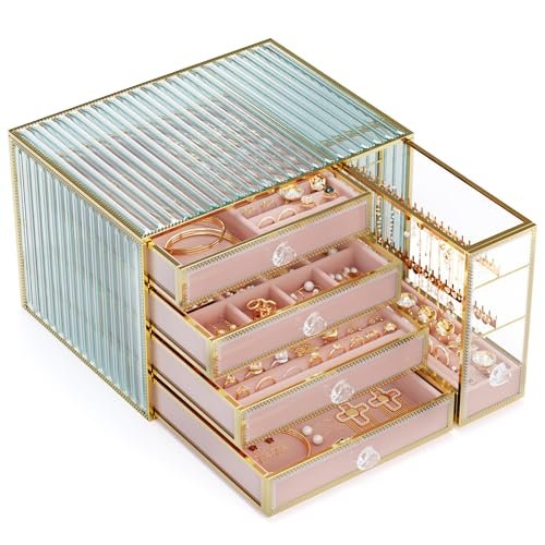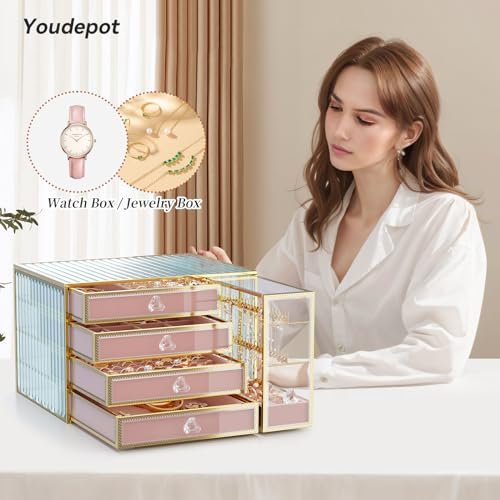 Youdepot Jewelry organizer box-Tempered Glass 5-Drawer jewelry boxes for women, Large Jewelry Boxes & Organizers With Velvet Necklaces Earring Organizer.
