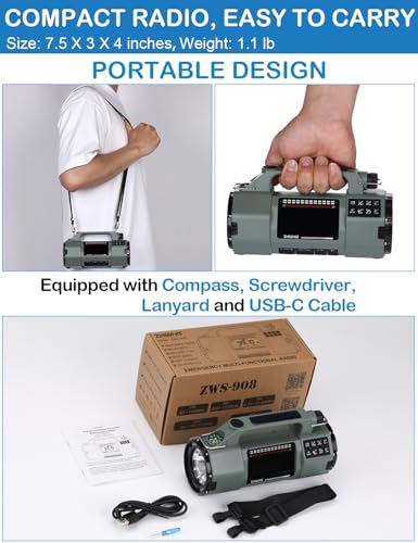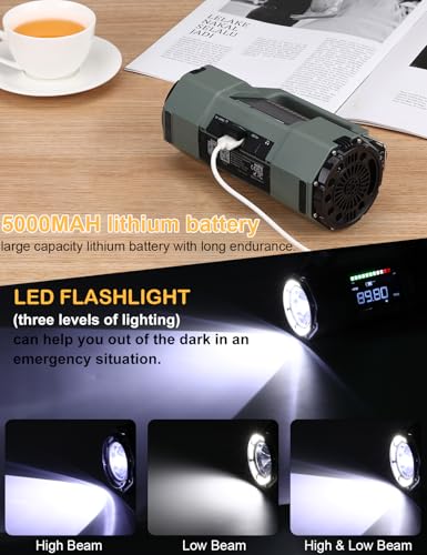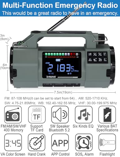 ZHIWHIS Emergency Radio with Bluetooth, Multi-Function Portable Radios with LCD VA Display, FM/MW/SW/VHF/WB Receiver with Alerts, Hand Crank/Solar/USB Charging, 5000mAh for Emergencies ZWS-908(Green)